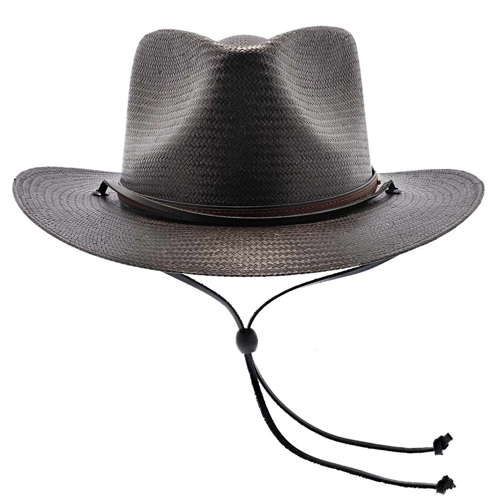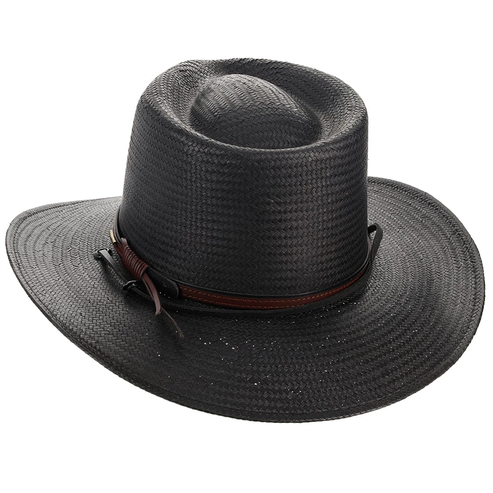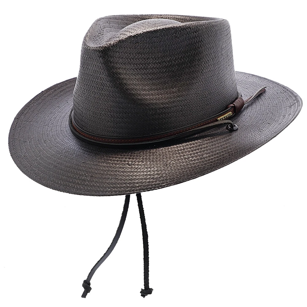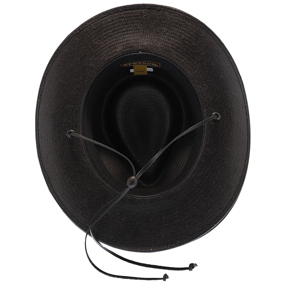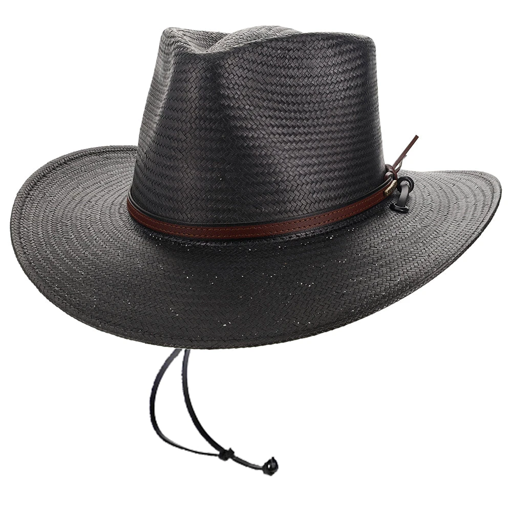 The Belgrade Shantung Straw Western Hat by Stetson gives that classic, cowboy look from the old West. Made from 100% shantung straw, this hat has a flexible brim and sturdy crown. There is a stylish, textured leather band wrapped around the crown, with the metal Stetson logo on the side. You can adjust the leather tassels with the circular, wooden toggle on the back. The hat’s sweatband is made out of cotton twill, which is a light-weight, breathable fabric for maximum air flow.