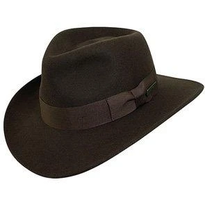In addition to our traditional Indiana Jones fedoras, we also offer this crushable, wool felt outback hat that is perfect for adventures and casual days. Like our fedoras, this dark brown hat also features the grosgrain band framing the brim and the Indiana Jones pin. As with our other outback hats, this one combines elements of the classic western with the fedora to really embody the idea of Indiana Jones: both rugged and sophisticated. An outback is ready for work and play, making it an ideal choice for everyday