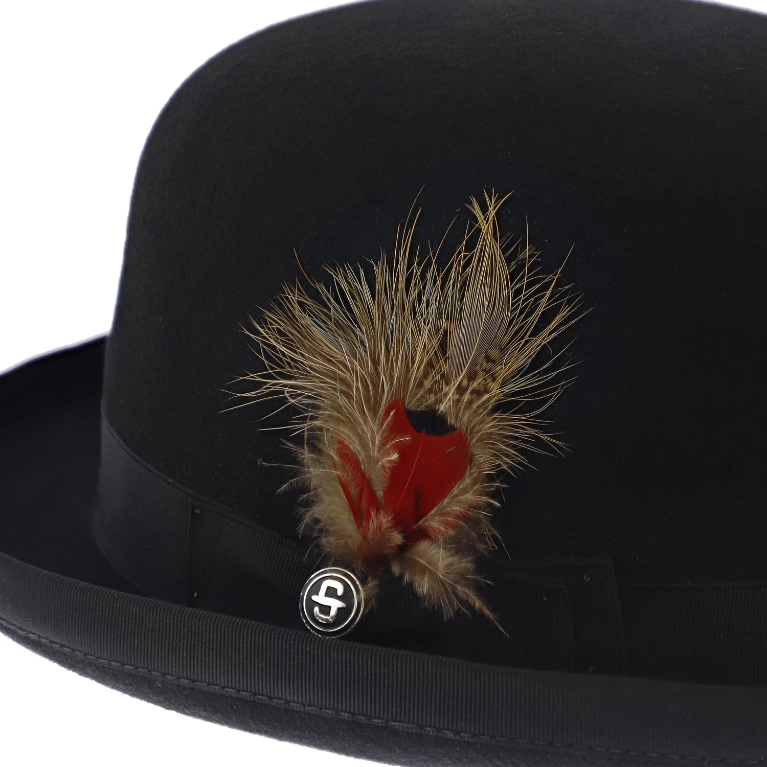 Calling all cool cats! Rock the house in the Wool Felt Derby by Stetson. Stetson’s Derby Bowler style hat, this sweet deal is made with fur felt with a 2.25″ curled brim, a black satin band and feather accent. The Bowler has a rounded top and inside is a leather sweatband.