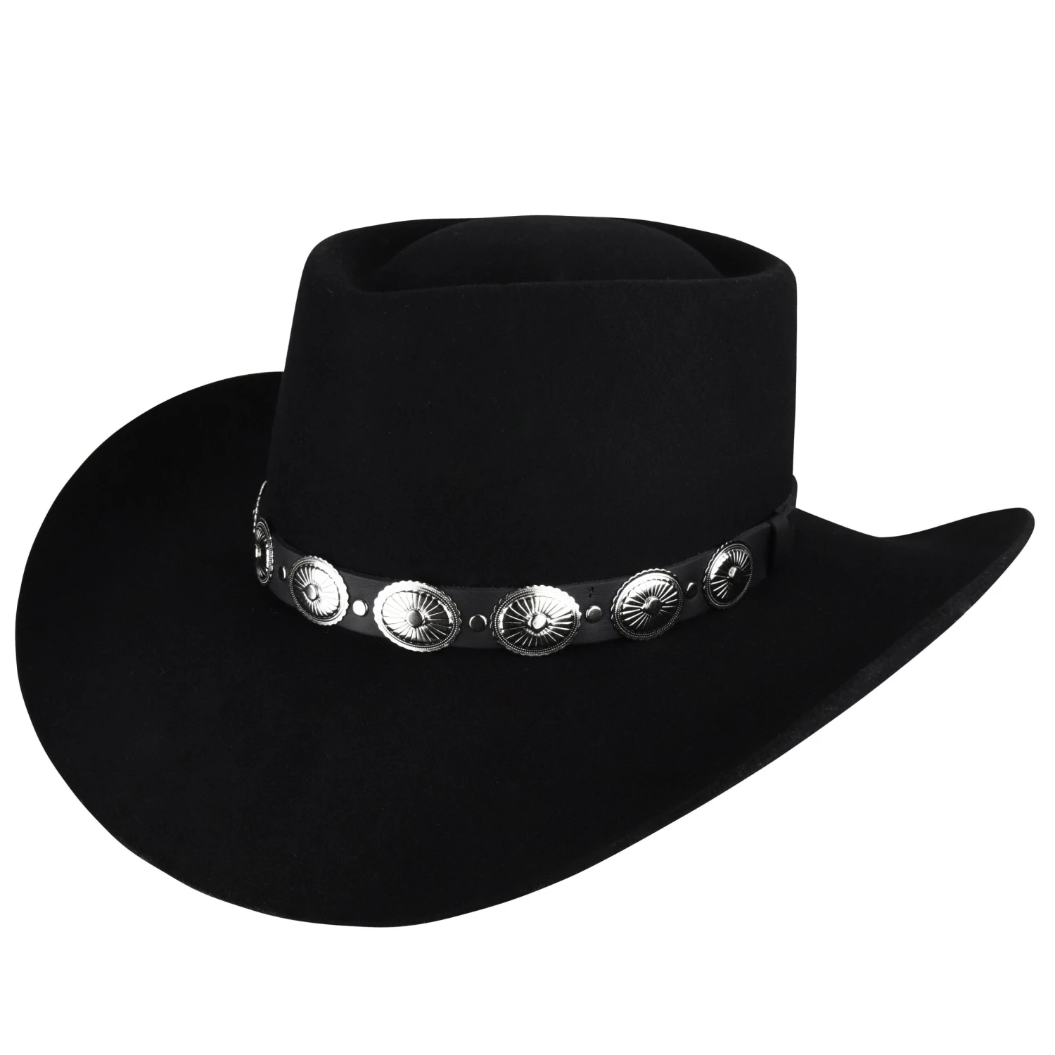 The Ellsworth has a teardrop crown, with a classic shaped 3.5″ brim. The Ellsworth Gambler is available in two colors that feature a leather band accented with silver concho’s. It is fully lined and has a comfort sweatband to wick away moisture.