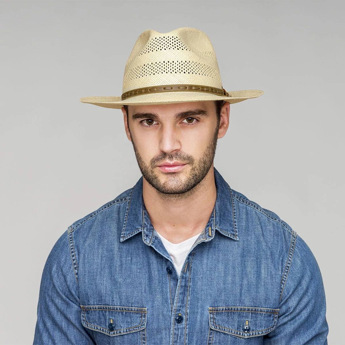 Only the most skilled Ecuadorian artisans have mastered the advanced technique required to weave this ventilated Panama style. Using a plaiting method that resembles basket weaving, each hat takes a few days to weave. The Ezra is blocked into a 4 inch crown and a 2 7/8 inch snap brim, and is finished with a distressed leather corded band, removable feather, and a finely woven sweatband.