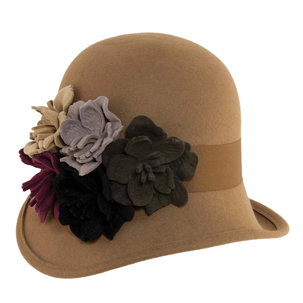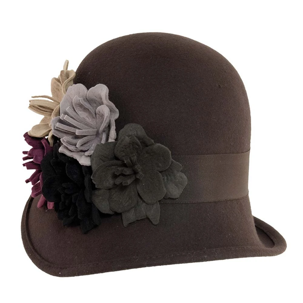 Wool Felt Cloche with Dimensional 1 3/4″ Brim | Grosgrain Band, Flowers | One Size Fits Most | Inner Drawstring Sweatband | Packable