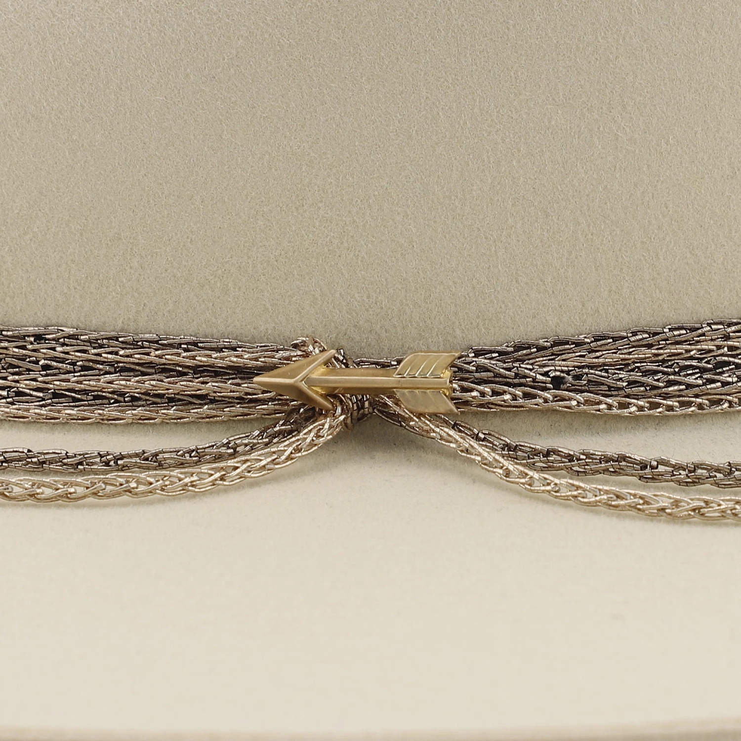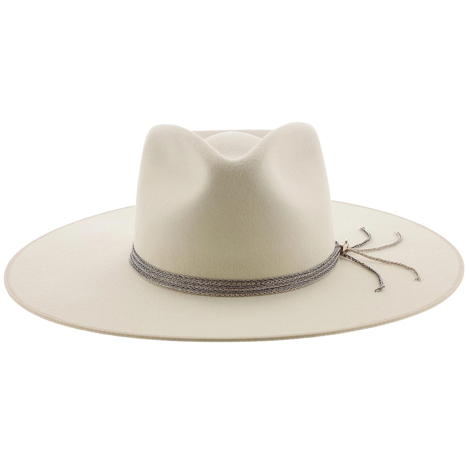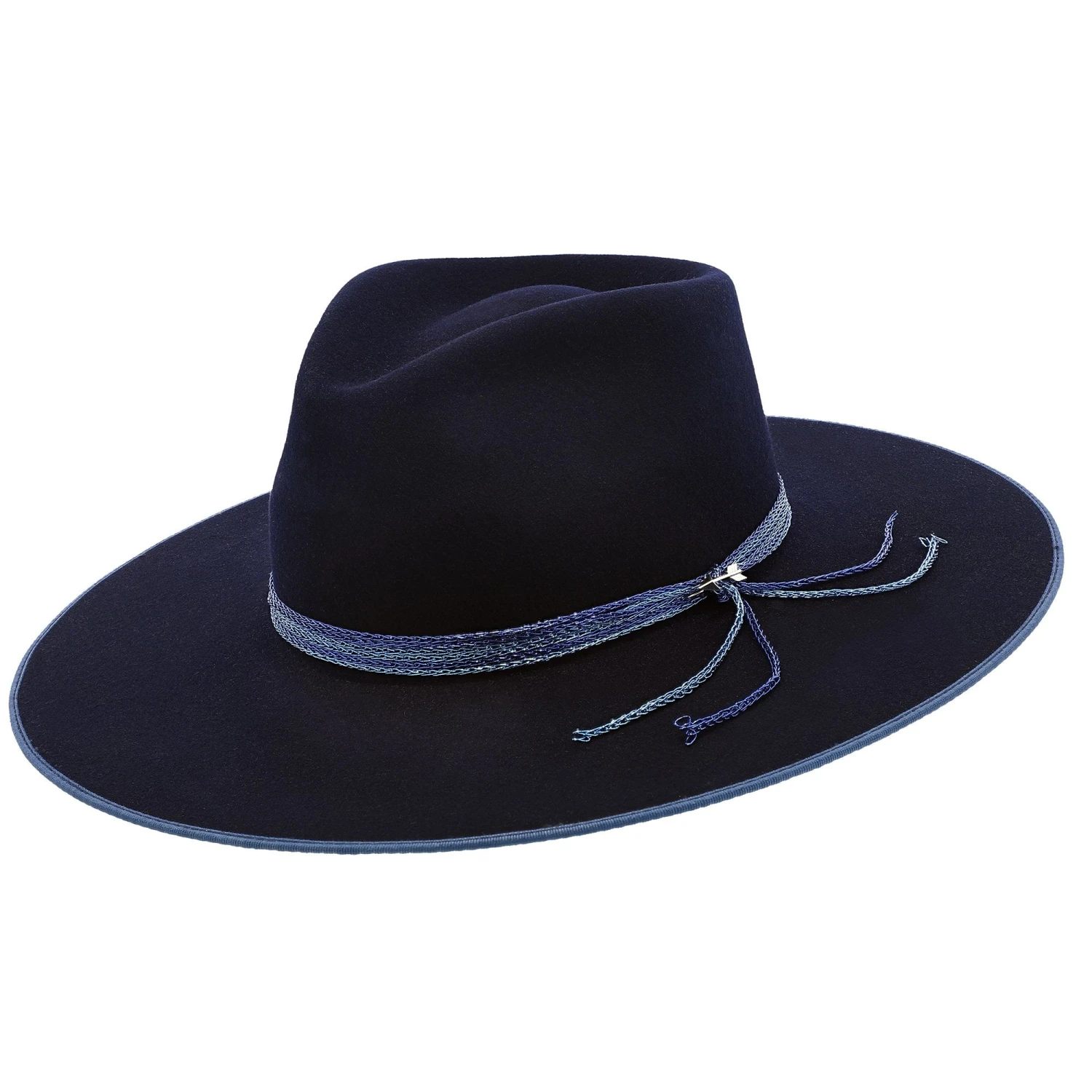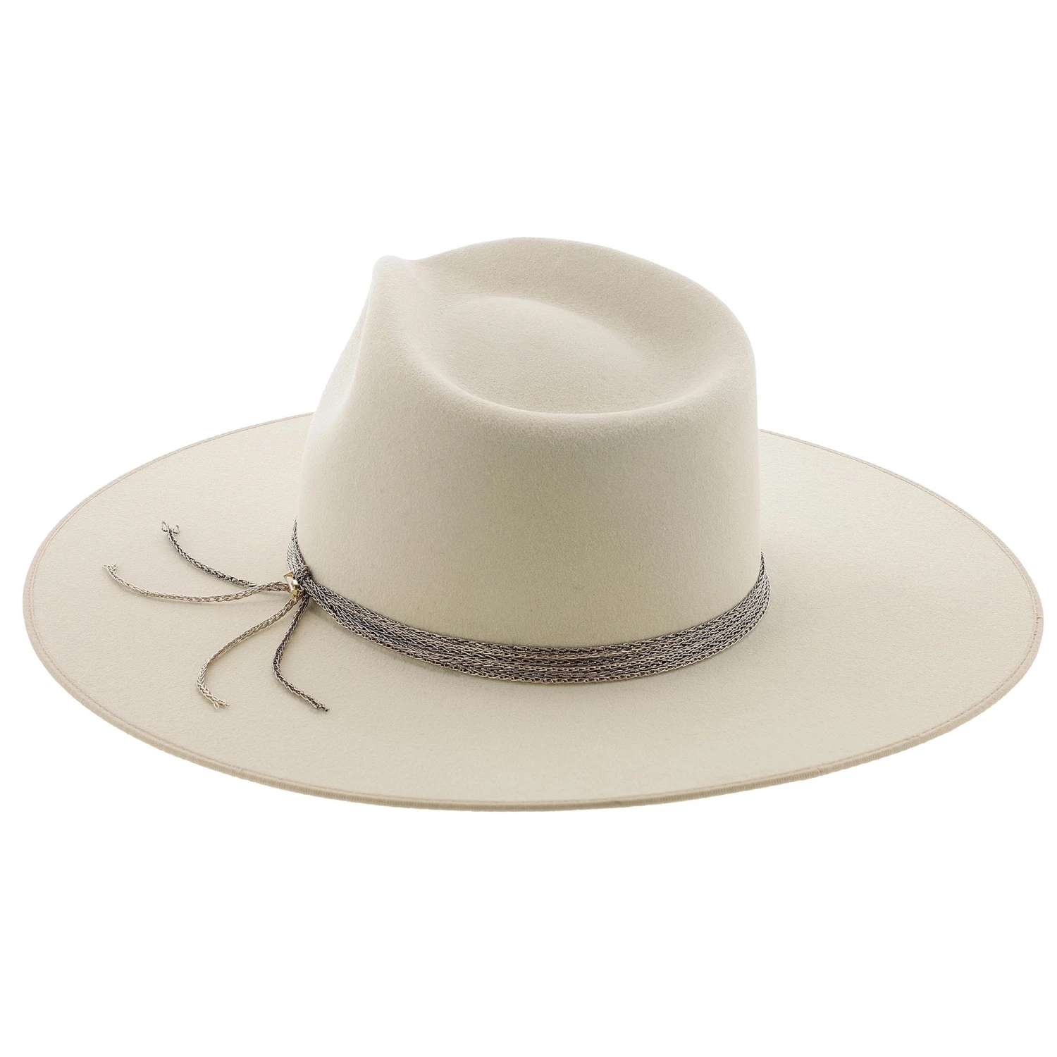 Made in the USA this 100% wool Stetson hat is brand new for the season. This firm felt flat brim wool hat has a a 4″ brim and a 4.5″ crown. Available in two exquisite colors Bone and Navy. The Bone color has a beautiful rose colored 5 chain link hat band secured together with a gold arrow for a little extra flair. The Navy hat rich in color also has a 5 chain link hat band to match the lighter blue hat bim edge. A silver arrow is a perfect compliment to this hat.