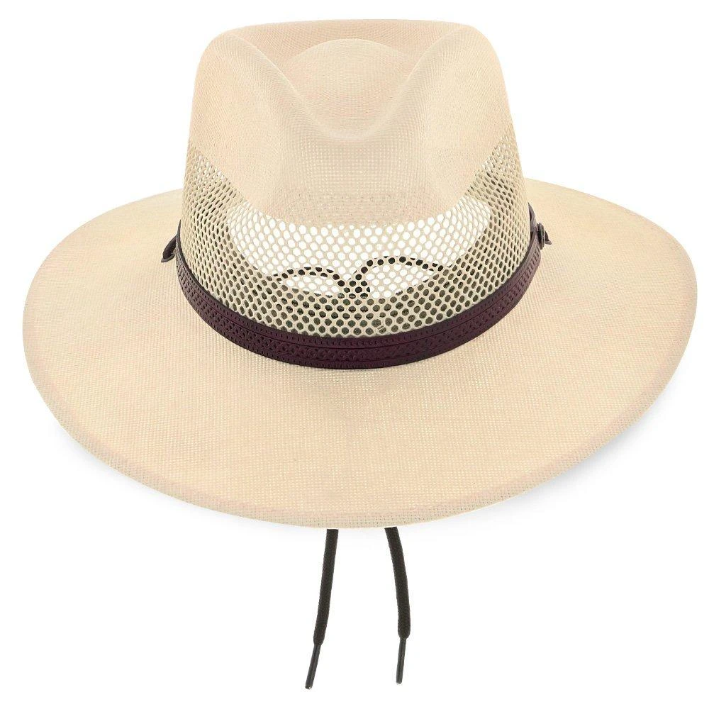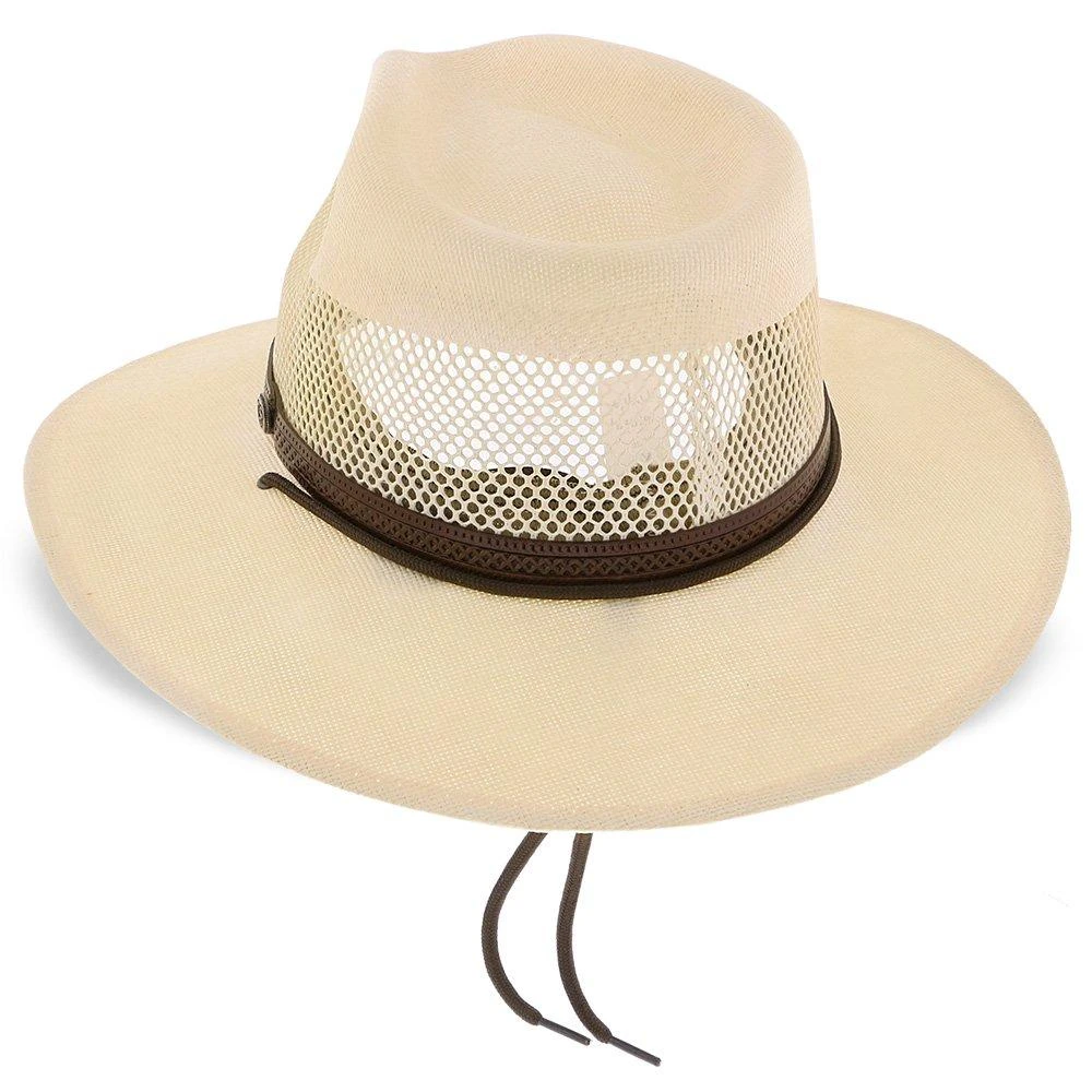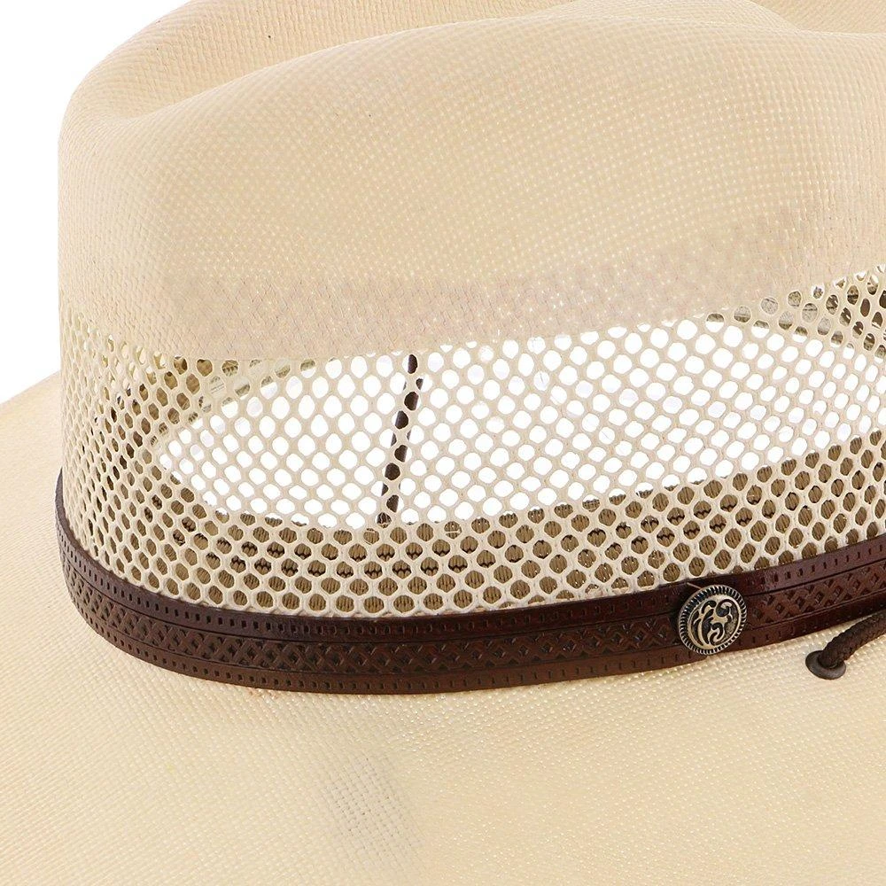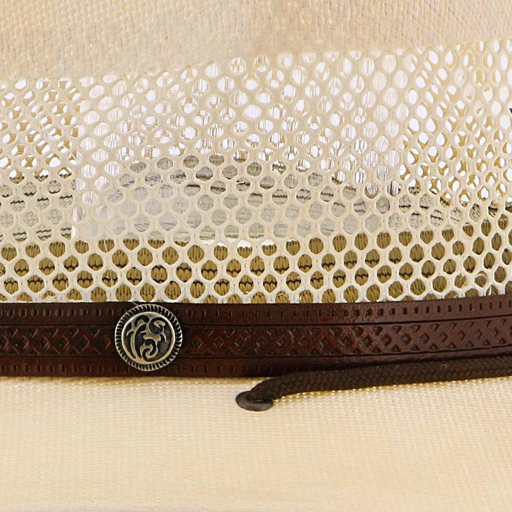 When you need a break from the heat the Stetson Lodge Straw Cowboy hat is your best option. Designed to keep you cool and collected while working on the ranch or riding the toughest trails. Crafted from lightweight and breathable straw, this vented cowboy hat has fully open mesh vents around the crown. Air flows right through keeping you extra cool while the generous 3 3/8″ hat brim provides extra shade from the sun. The dri-lex sweatband helps wick moisture to keep you dry and chin chin straps keep the hat in place. A leather hatband with accent provides contrast for the tightly woven, smooth straw exterior. A true cowboy’s hat perfect for ranchers, farmers and anyone who wants to tame the heat.