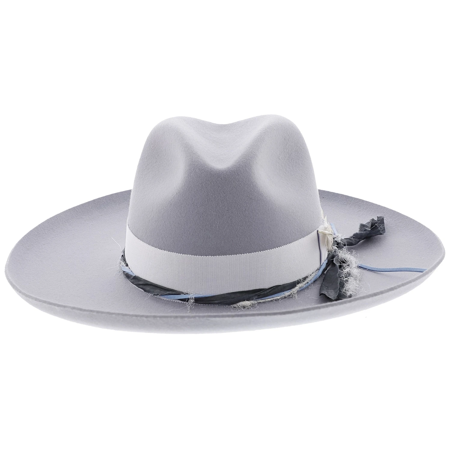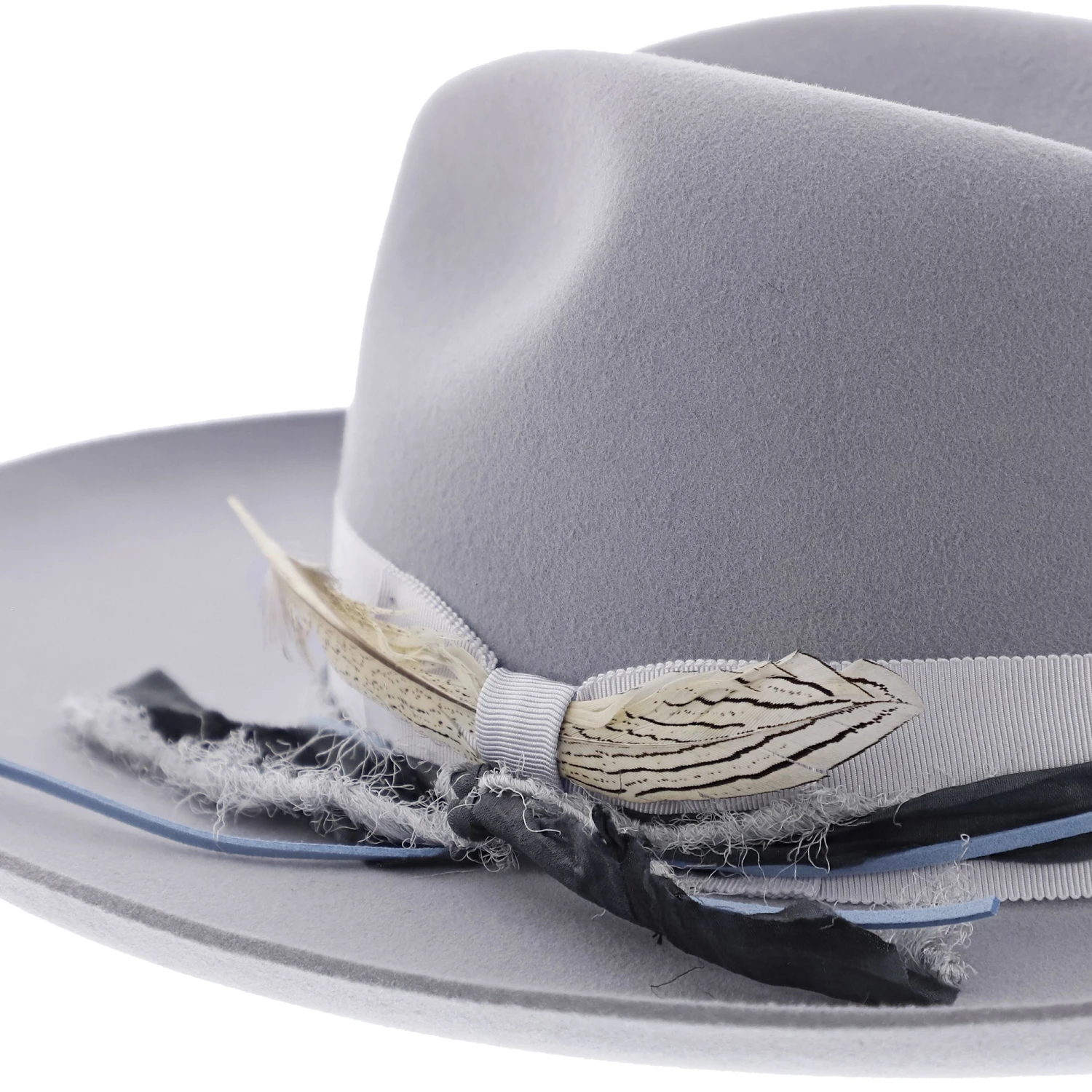 The Oceanus Hat by Stetson is yet another gem in the Seeker Collection by Stetson. It is a beautiful grey color with two hand dyes silk cords twisted together adorning the hat band. The brim is 4″ long with a pencil and stiff build.
