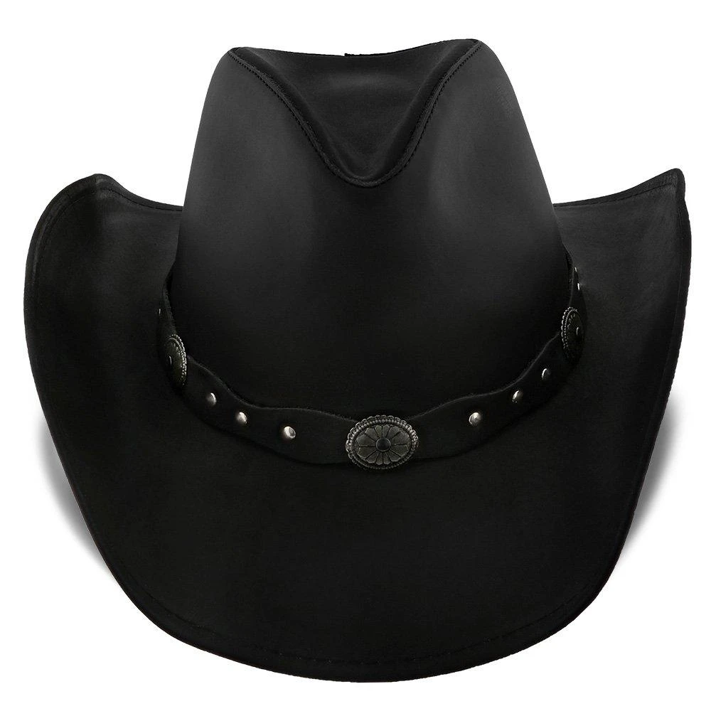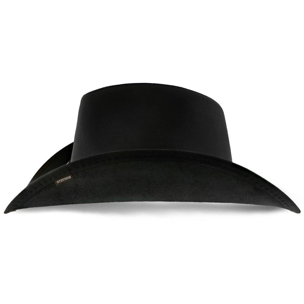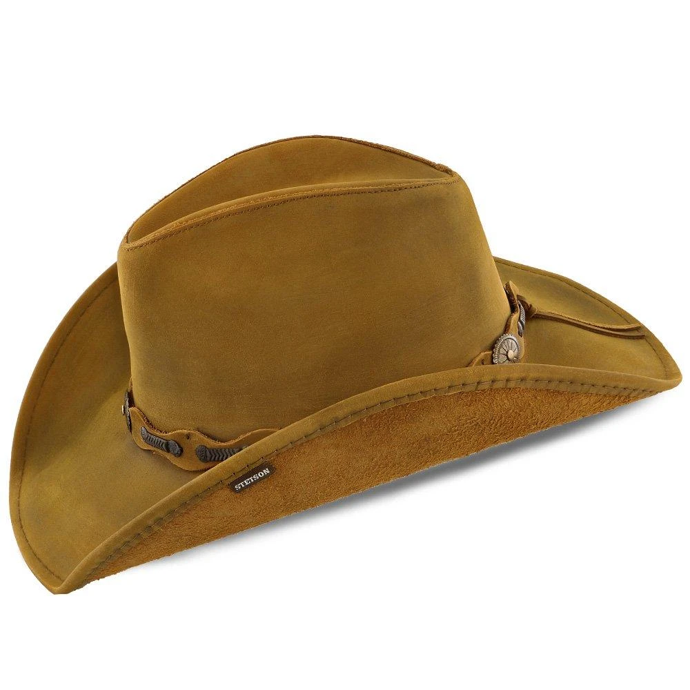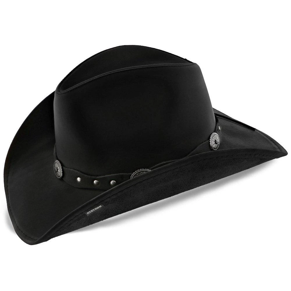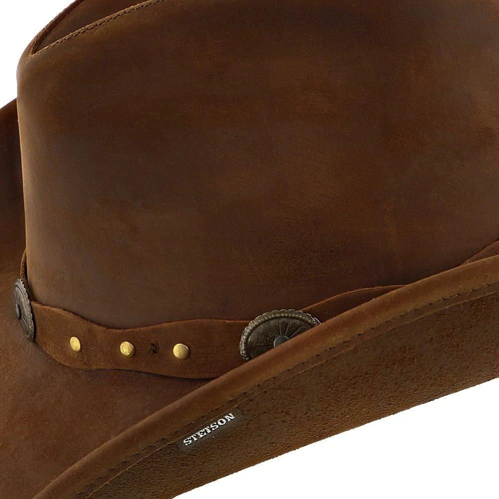 This handsome Roxbury Stetson leather cowboy hat has lots of style. Notice the attractive studded concho band that adds a masculine yet refined urbane look. Made of high quality leather, you will feel self-assured that this hat will last for many years. This flexible hat gives you the freedom to dress it up for a special occasion or dress it down with your favorite boots and jeans.
