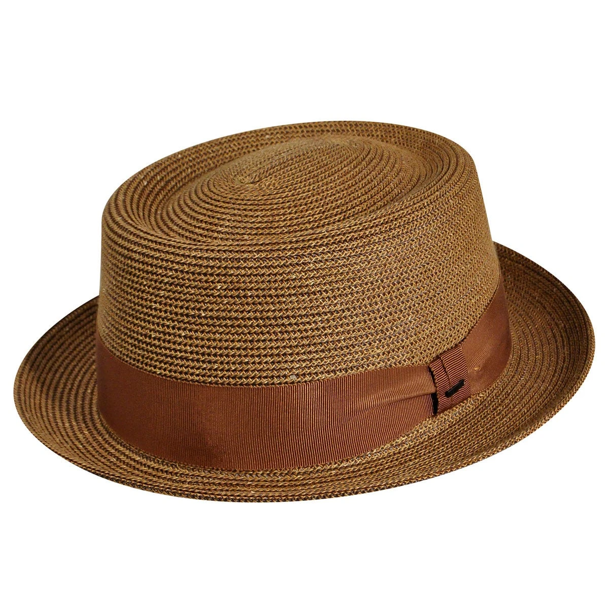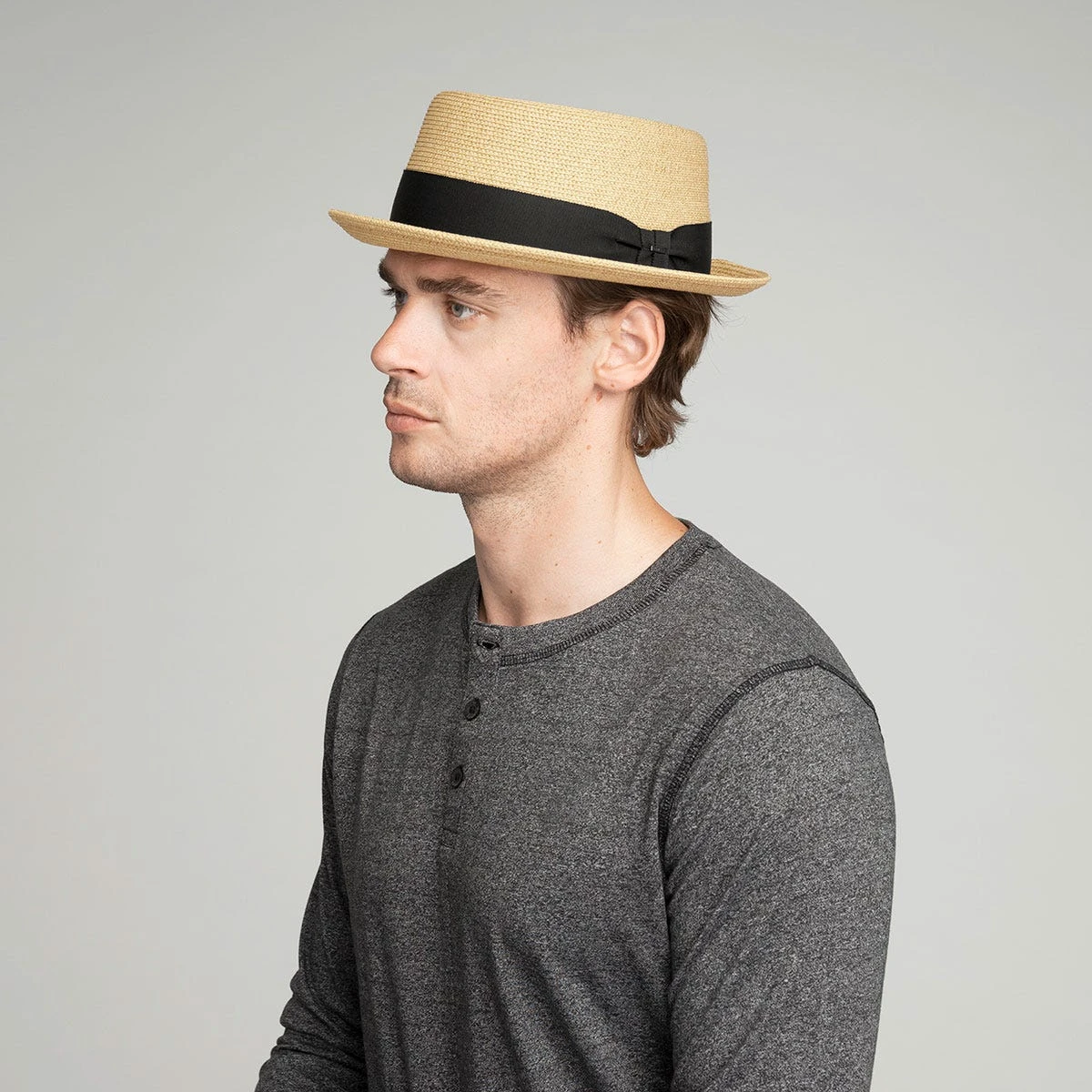 The Bailey of Hollywood Waits is a smooth and sleek braided pork pie with a traditional telescoping crown, a grosgrain ribbon hatband, and a stingy upturned brim.